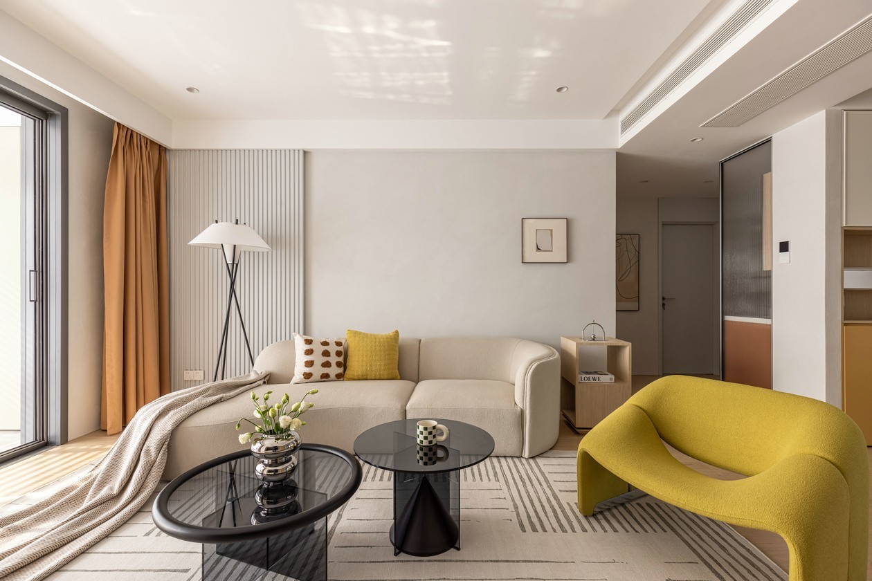 线条简洁的现代空间中大面积运用暖白与原木,搭配浅草绿,趣味黄等色系,达到温馨且有格调的居家氛围。