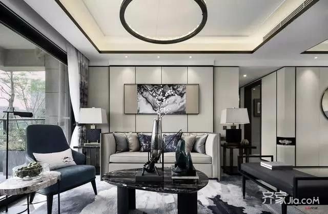 客厅“运墨而五色具”,将黑白灰木色中和 ,加以黛蓝色点缀,脱俗、空灵,突出了一种***东方美。