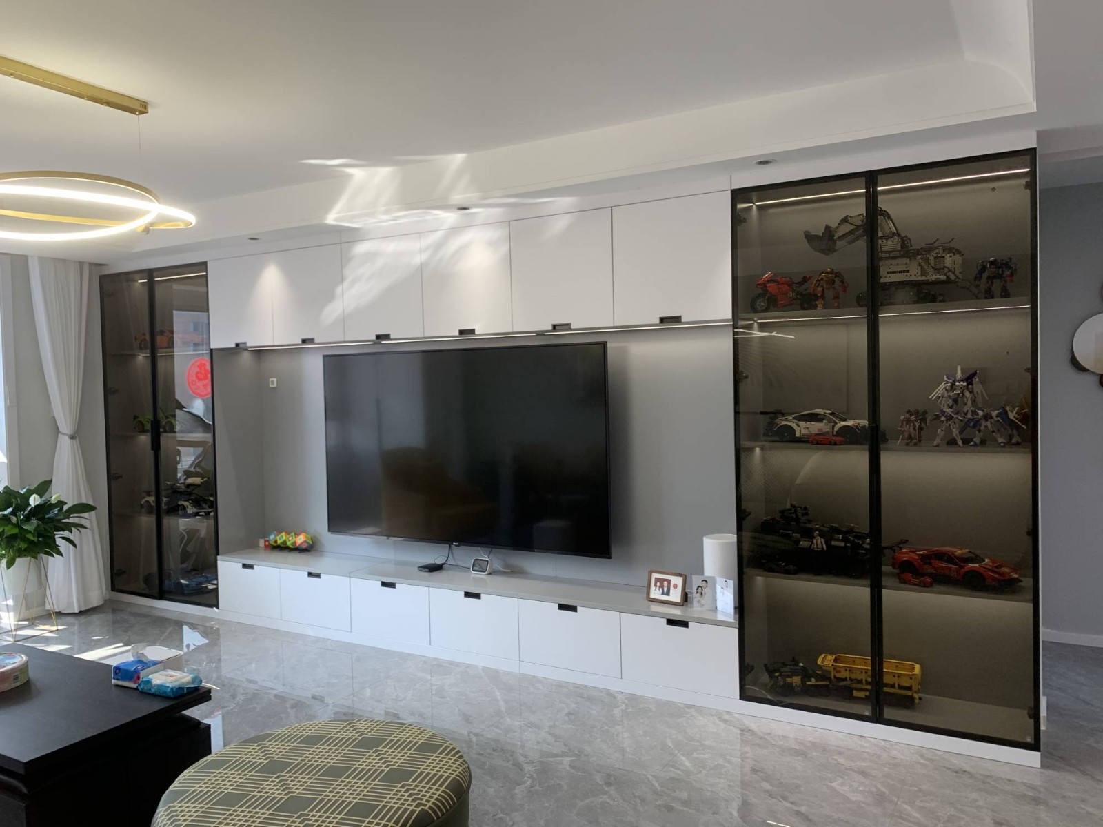 应业主要求,家具以简洁的款式为主,没有过多修饰,电视背景墙收纳空间特别多,两侧设计玻璃橱窗摆放喜欢的乐高玩具。