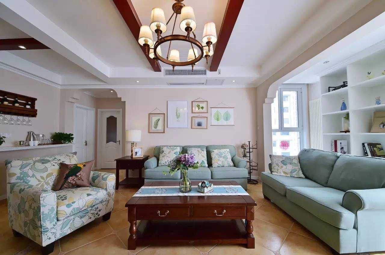 该户型为三房两厅一厨两卫,风格为美式田园风。美式田园风整体搭配偏向于自然原始,碎花元素+美式大床+铁艺元素+实木元素,这便是美式田园风的特点,清新舒适。