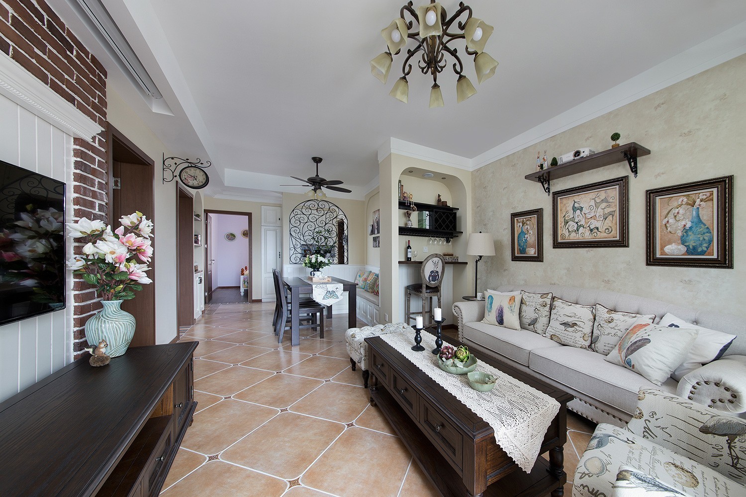 客厅作为待客区域,以大面积的复古地砖来彰显美式乡村自然复古的韵味。