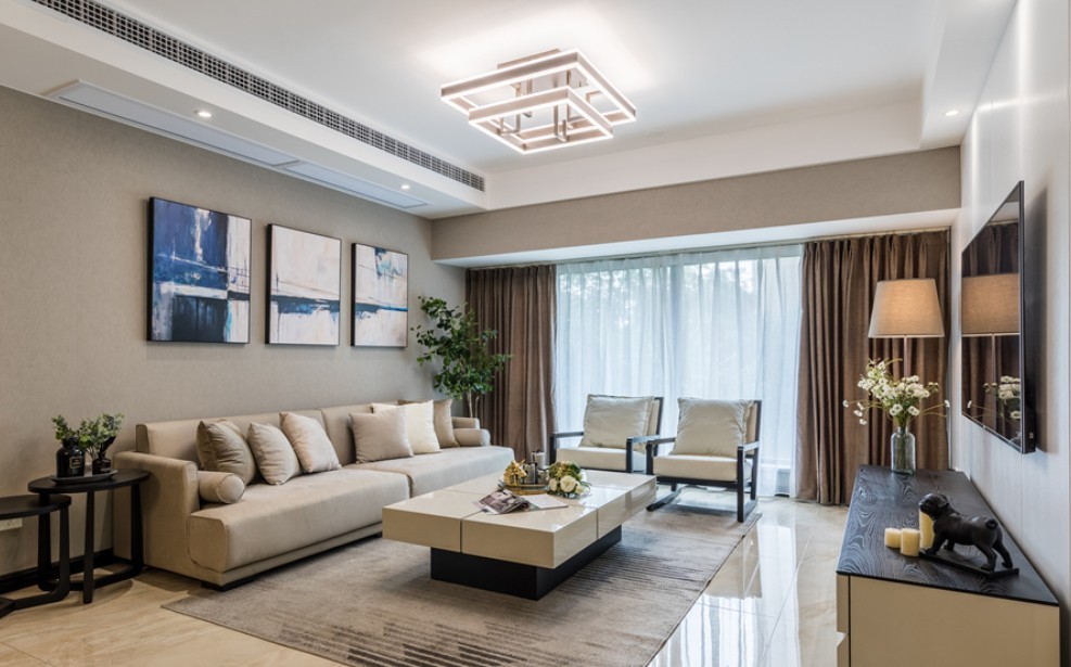 根据屋主需求,家里要配备中央空调与新风系统,所以做了局部吊顶来装饰遮挡,主灯选择与吊顶相似高度的灯体,与之平衡;