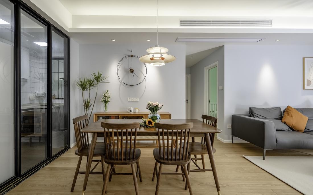 北欧风格的空间中,自然采光显得十分重要,作为本案这种低楼层的空间来说透过窗口有这种采光量十分难得,外面的树木郁郁葱葱绿意盎然让人心情不自觉就变得很好
