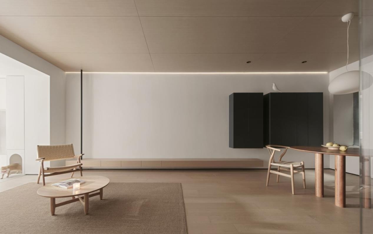 在视觉干净的白色空间中,我们希望它可以获得稳定的气场,通过色调柔润均匀的木饰面天花板来拂去白色的轻浮,遵从简约,光照进层层木色间,生活在这里的人与空间连结形成独有的形式,是生长出来的家。