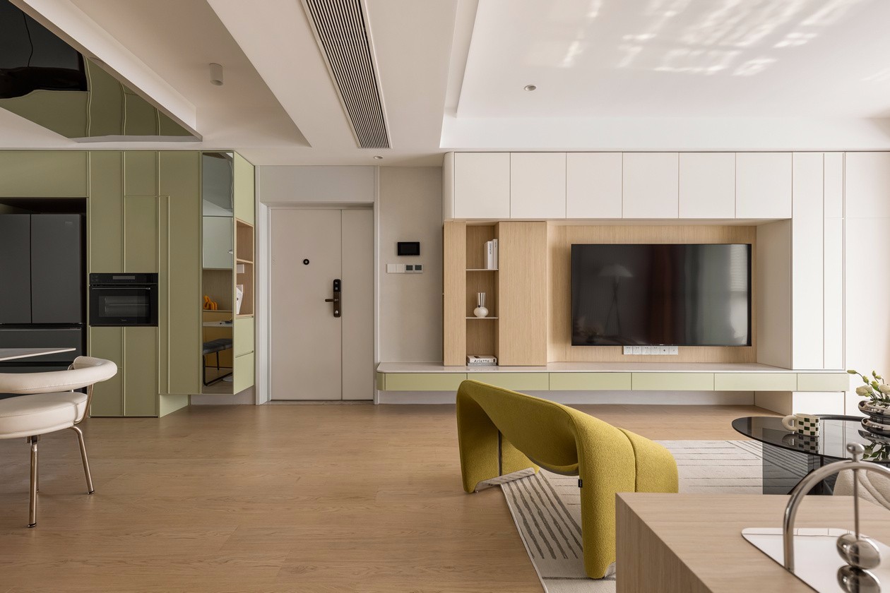 整体采用无主灯设计,踢脚线也被艺术涂料代替,空间自上而下流畅一体,营造统一序列感,扩大空间视觉。整铺的原木地板让空间延伸性更强,自然的行走触感也让紧凑的都市生活在回到家后得到释放。