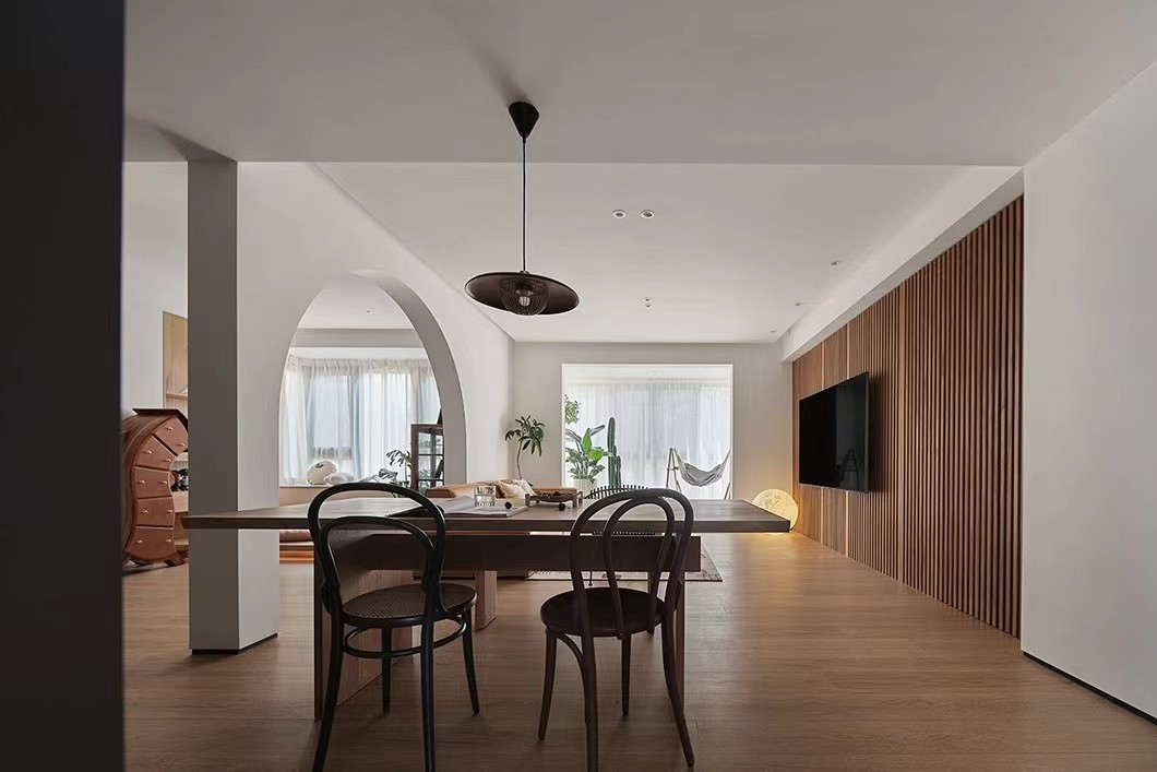 客餐厅与书房像是亲密咬合的齿轮,功能交错近在咫尺又自然分割。拆除一间卧室打造出书房,空间融合之后可以共享空间、共享功能也共享视角,家庭的氛围感更加融洽。