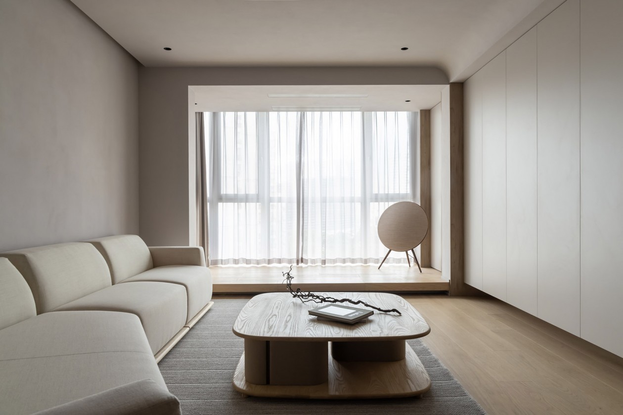 将空间功能整合,用单纯的底色覆盖这个生活容器,使得空间本质尽显纯净。舍弃华丽的装饰,放下对光的执着,逆光之下的空间同样具有魅力