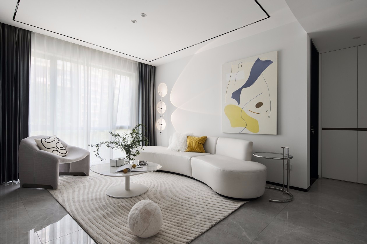 客厅以简约的白为基调,轻柔的线条水彩画,和地毯以同色系相衬,注入艺术的美学表达,丰富了居者内心的生活色彩,白色的包容,往往体现于多层次的色彩与材料搭配