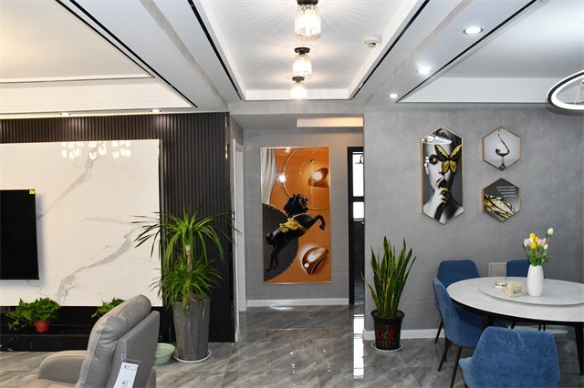 客厅整体的颜色是浅灰色为主,搭配橙色挂画显得奢华稳重