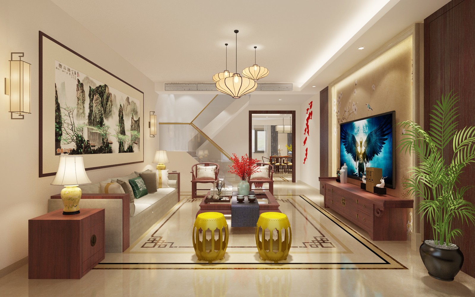 此空间为客厅空间,为新中式风格,在中式元素的基础上融合了金属元素 ,实德空间不像纯中式风格那样稳重