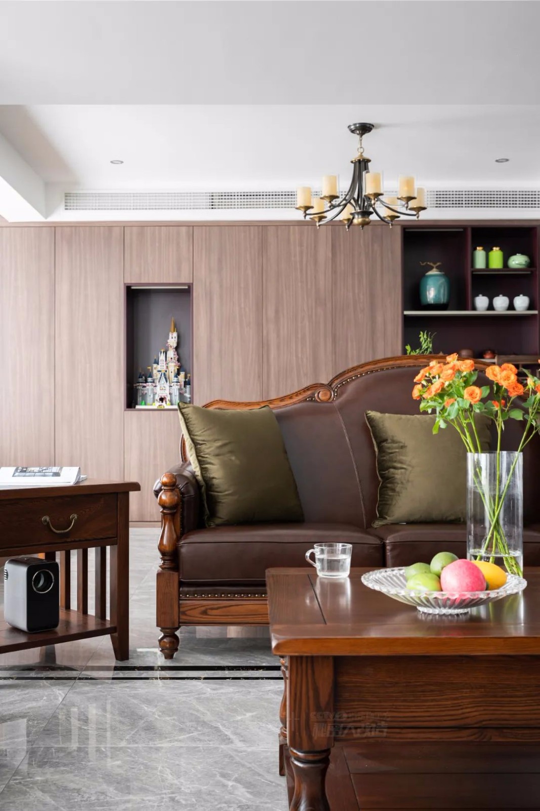 合围的实木家具围出一家人温馨的相聚时光。灰色的大理石干净清爽,中和了实木家具的厚重;