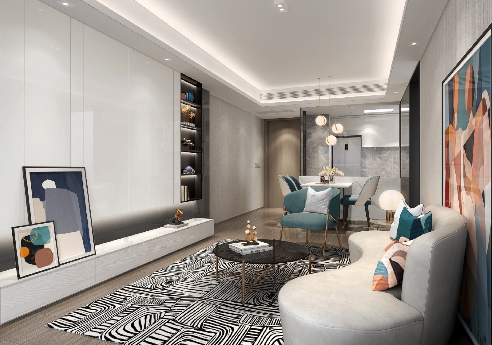 整体空间以白色打底 配合冷暖色搭配的软装空间