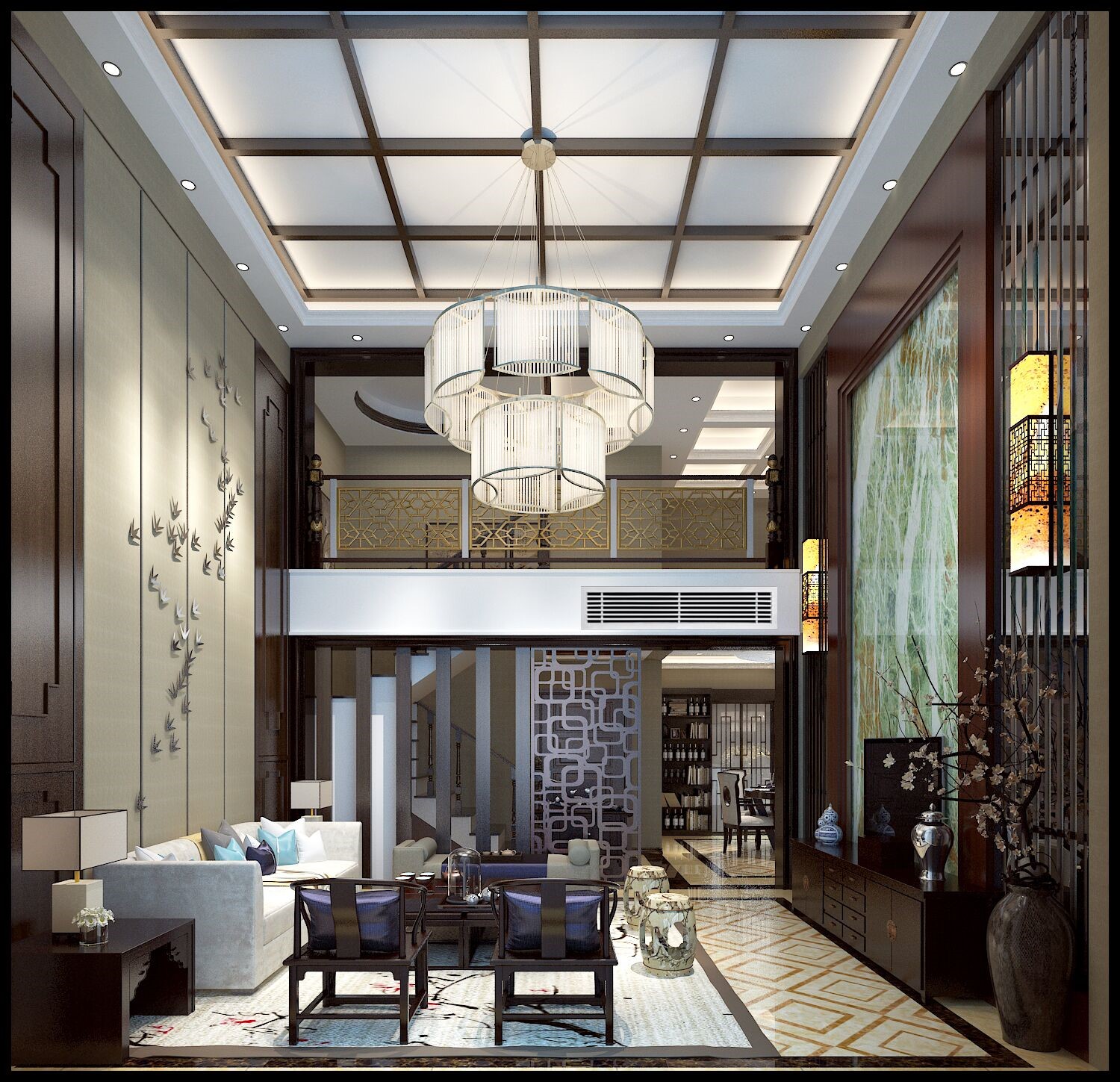 客户用深色墙板去设计,顶部用传统的九宫格的方式去设计,体现古典文化气息。