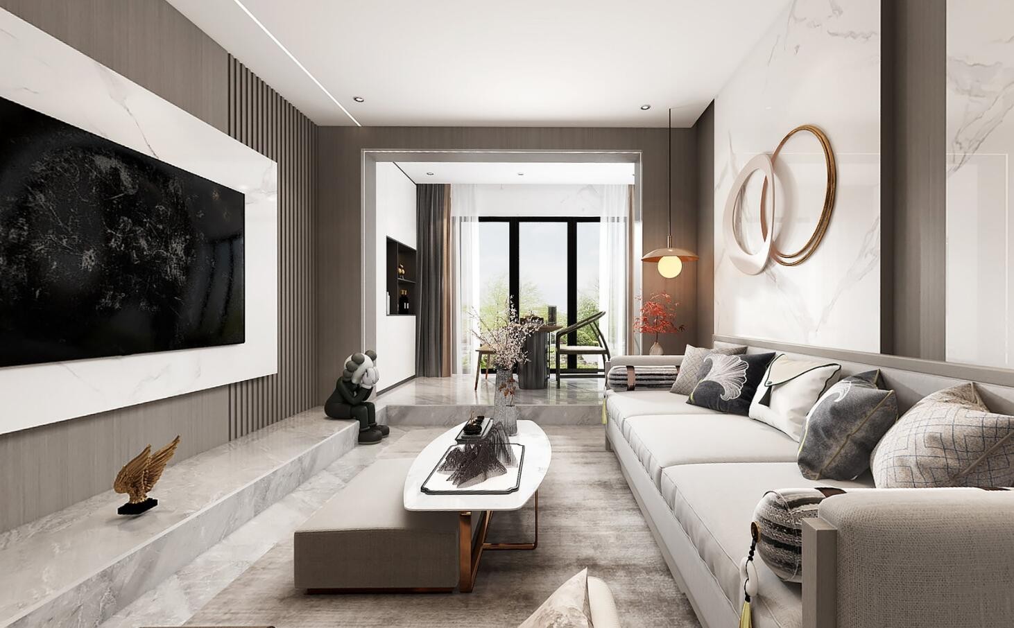 电视背景墙采用格栅板与木饰板搭配着白色石材进行拼接设计,丰富空间的层次感。将客厅外的阳台打通,做一组定制的柜子,将阳台打造成一个休闲区域,作为主人的休闲使用。