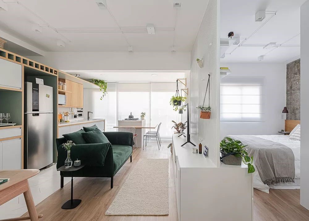 客厅整体以白色为主,搭配上原木家具和绿植装饰,简约自然又清新。