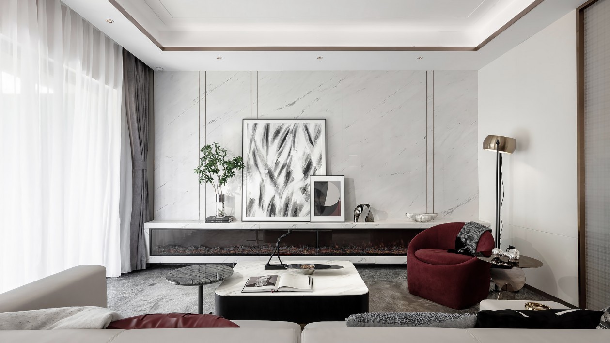 客厅空间以大面积的暖白色铺陈开来,居者最爱的那一抹红裹挟着热情,点缀其间,串联起家中的每一个房间,赋予空间生活的热情。
