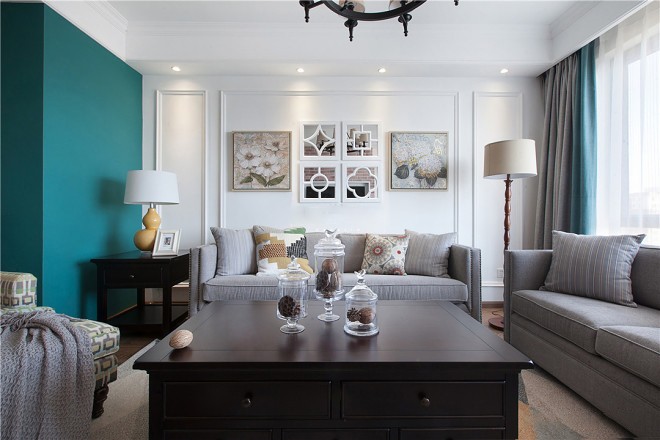 客厅选择白色系打底,用线条突出美式风格,黑色木质家具与布艺沙发搭配,增加了空间的厚重感,有一点复古的味道。