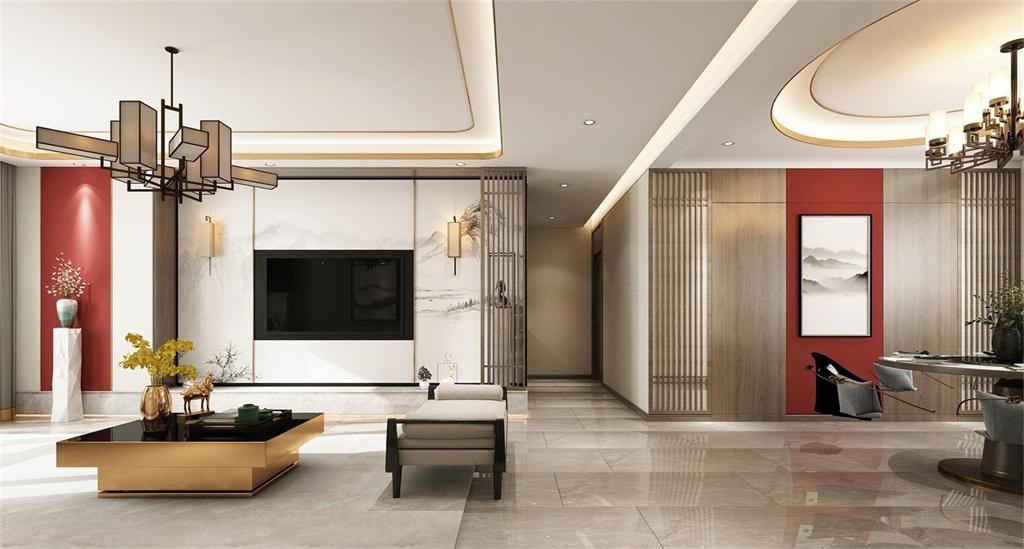 客厅传统的围合式,案几有序,分合有致,极具大宅之气,加上朱砂的点缀,让古朴的中式意境透露出婉约的气质。
