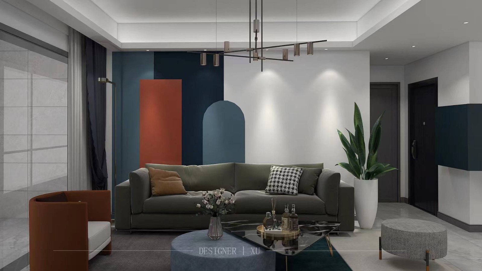 玄关空间的鞋柜采用深蓝色,和客厅背景墙色调相协调。