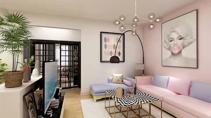 马卡龙色系沙发,为定制品,设计上线条造型硬朗,衬托糖果色系的布料,营造刚柔并济的气氛。方几几何线条的框架放在毛地摊上,呈现出现代的结构感。沙发,茶几中金属质感框架与家中其他家具呼应,让空间更具气质。客厅里的木地板一直铺装到卧室,加强了空间的流动与连贯感。又稍稍的调皮,选择了小空间书房地面铺装上跳跃的花砖,打破地面一成不变的视觉感。