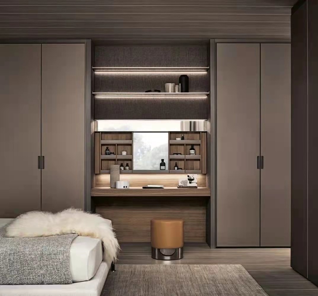 卧室设计的很有***感,在储物柜里还预留的梳妆台的空间。