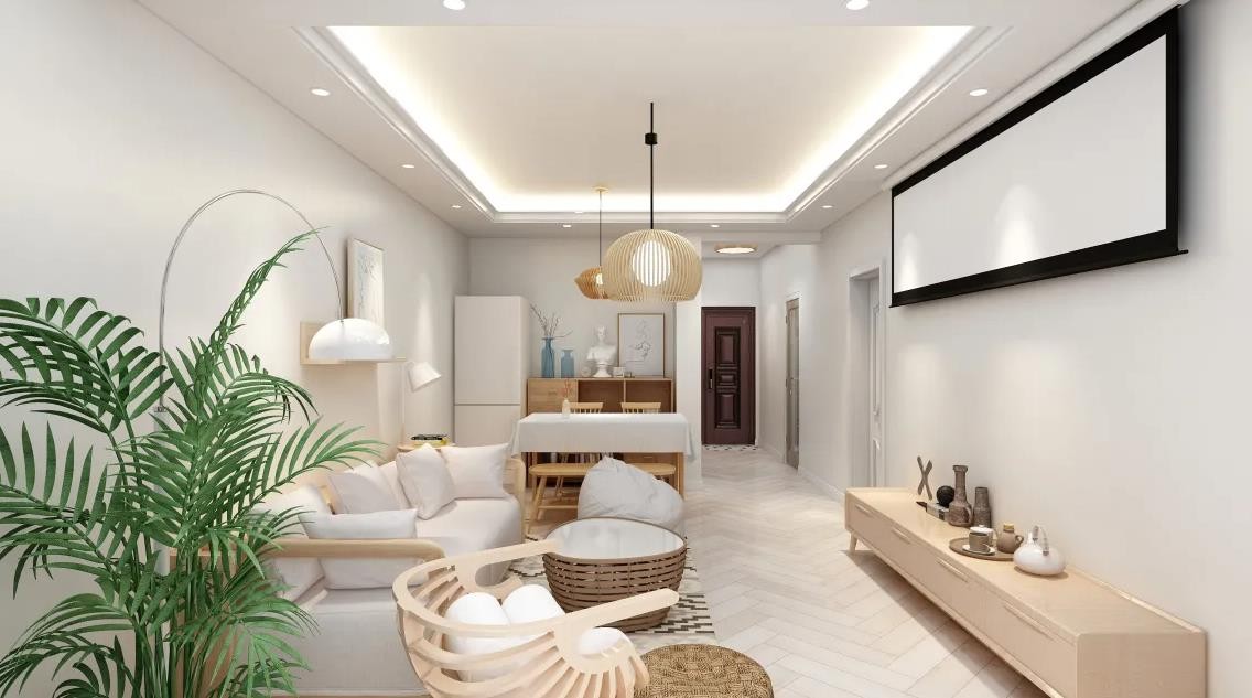 客厅大面积采用白色加原木色为主,时尚简约,增加了客厅的亮度