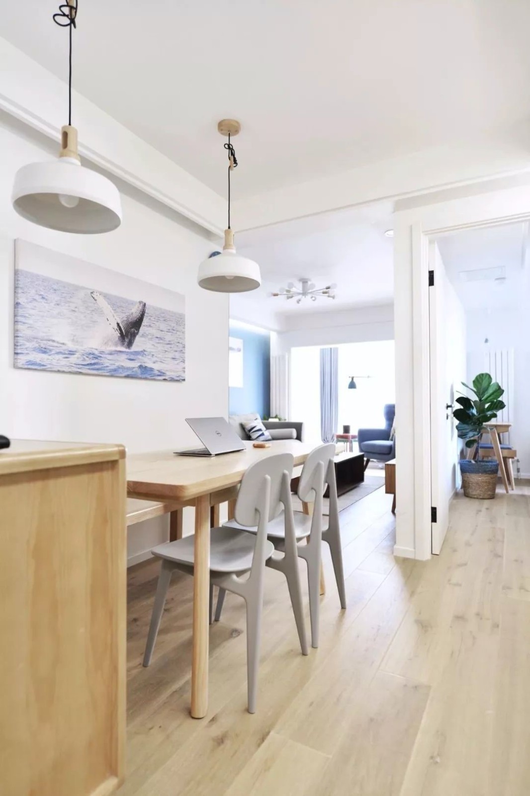 入户就是餐厅过道,整个房子也没有一个独立的玄关空间,位于走道上的餐厅,就比较适合长条形的餐桌。