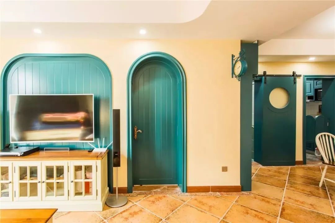 浓浓的地中海风情清新的蓝色与明亮的米黄色有眼前一亮的感觉用拱形门洞的设计。将主卧门改到电视墙这里采,与电视墙拱形背景设计保持统一形式成为墙面灵动的装饰。