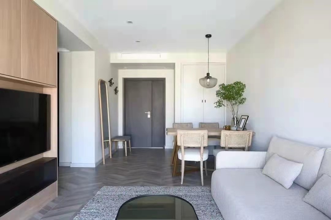 木地板搭配原木色柜子外加绿植进行点缀,使得空间有一定的层次性。
