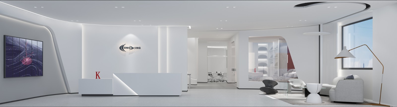 整体空间包含前厅、展厅、休息区、会议室、开放式办公区等。黑白灰色调的前厅,整体以弧形为主。