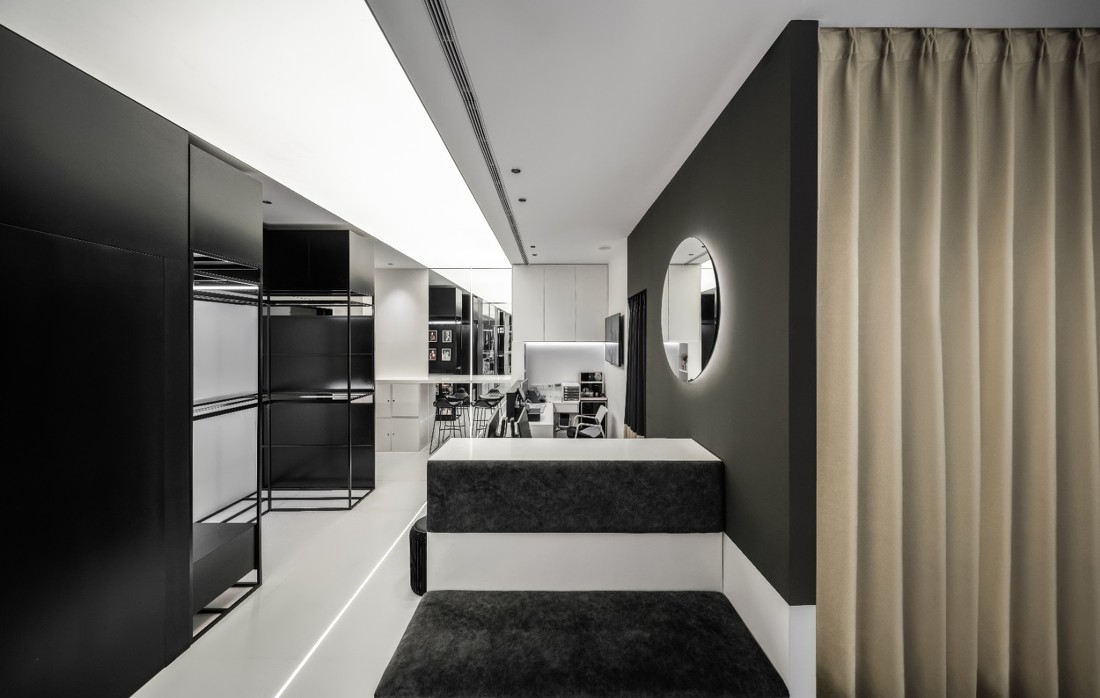 再辅以黑色元素来完善空间的节奏感和丰富性。大量的镜面模糊了空间的边界,放大视觉效果的同时,也让顾客在空间里任何位置都能轻易地整理妆容。