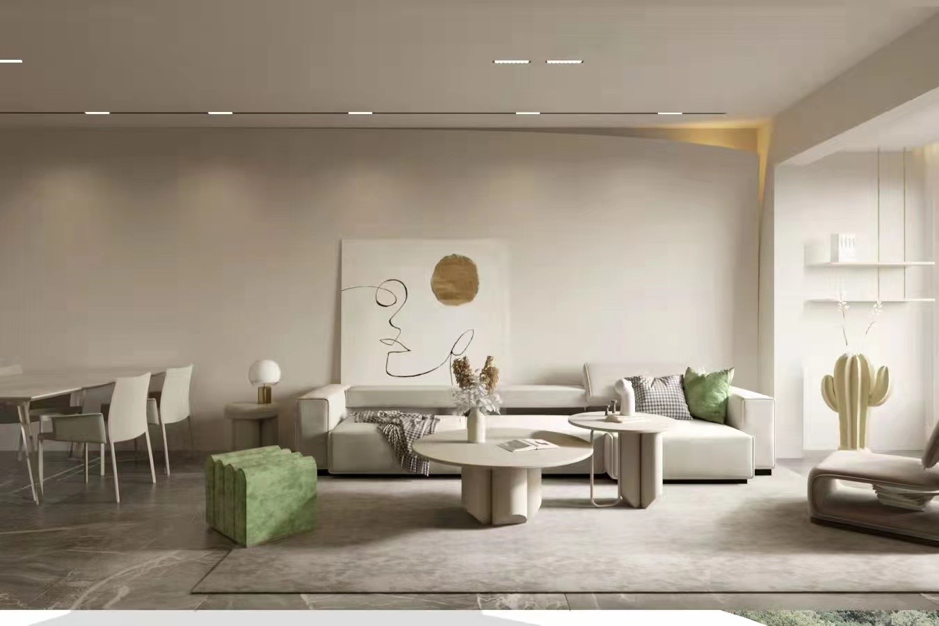 沙发背景墙大面积采用暖***术涂料与家具相呼应,衬托了安静的氛围,顶面采用掀角暗藏灯带的手法,使整个背景墙灵动了起来