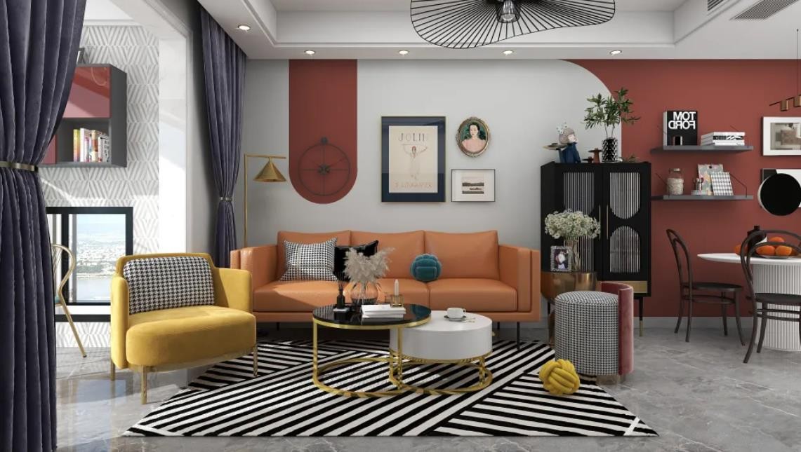 客厅设计充满活力,白色背景墙加上橙色点缀,家具鲜艳的颜色,整体色调和谐统一