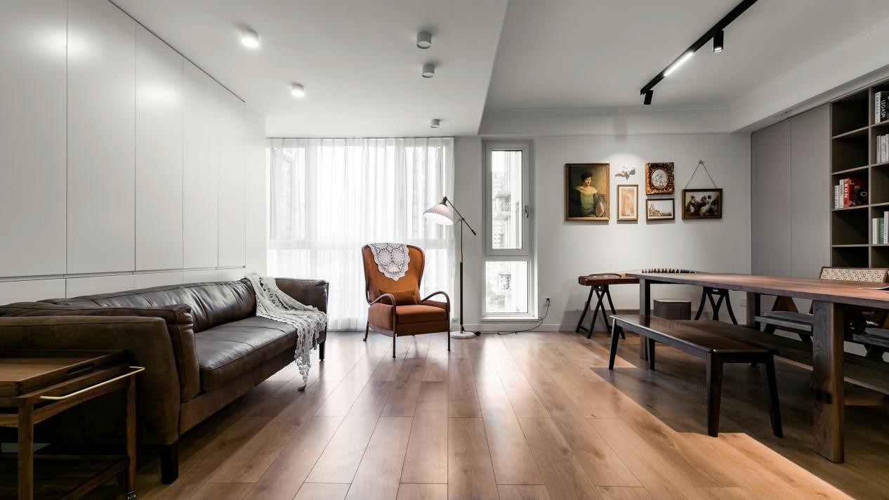 客厅上方做了双重吊顶,一侧向上做了延伸,让客厅层高显得更高,另一侧则使用筒灯代替主灯,让吊顶处视线更加通透。 沙发背景墙选用白色饰面板通铺设计,上面有竖向条纹用于勾勒沙发选用直排样式,深褐色的色调带有仿古的特性,皮质材质更为柔软