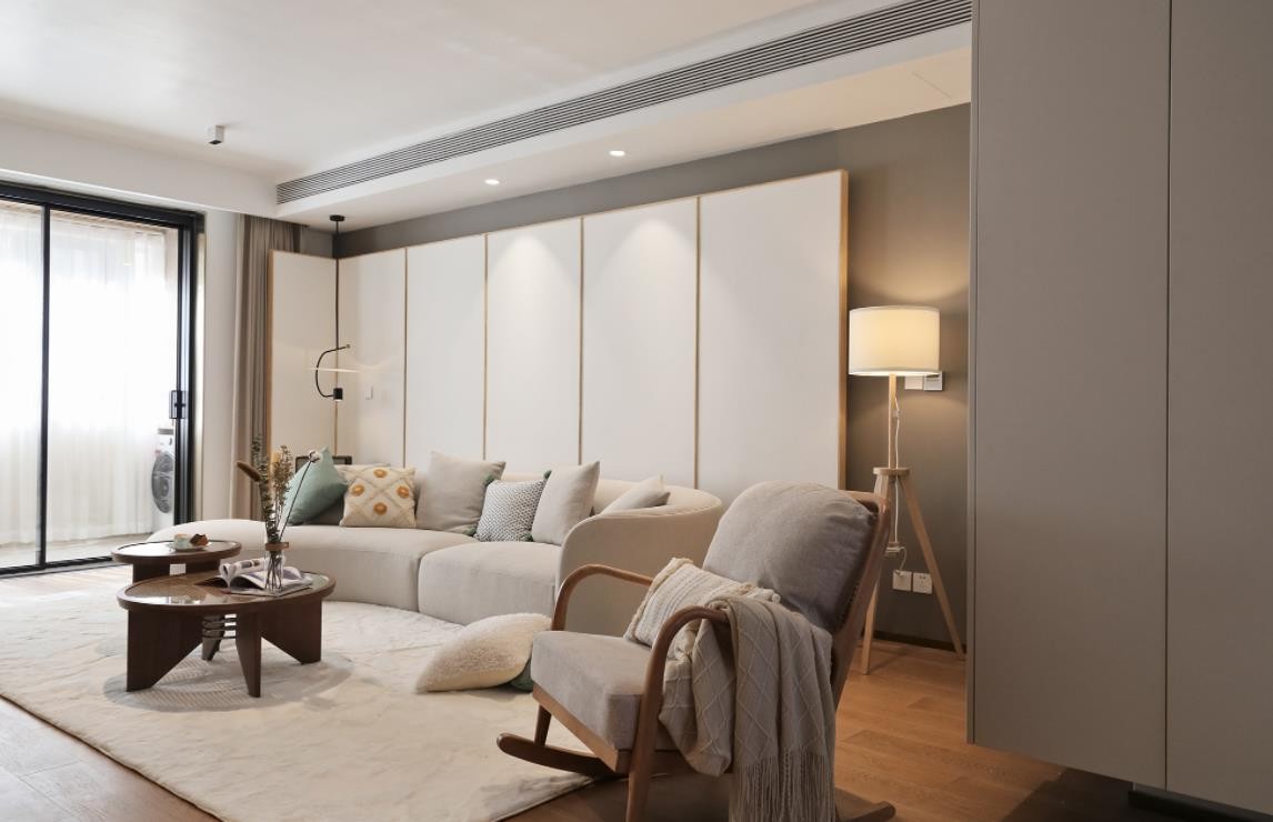 相对应的玄关柜门与客厅沙发后面的隔断统一采用白色,同时嵌入的柜体采用原木色板材与家具的材质互相呼应,使空间具有连续性和整体氛围感