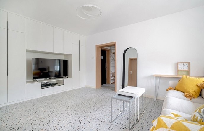 【客厅】利用客厅的进深在沙发对面增加了一组储物柜体,增加全屋的储物空间。