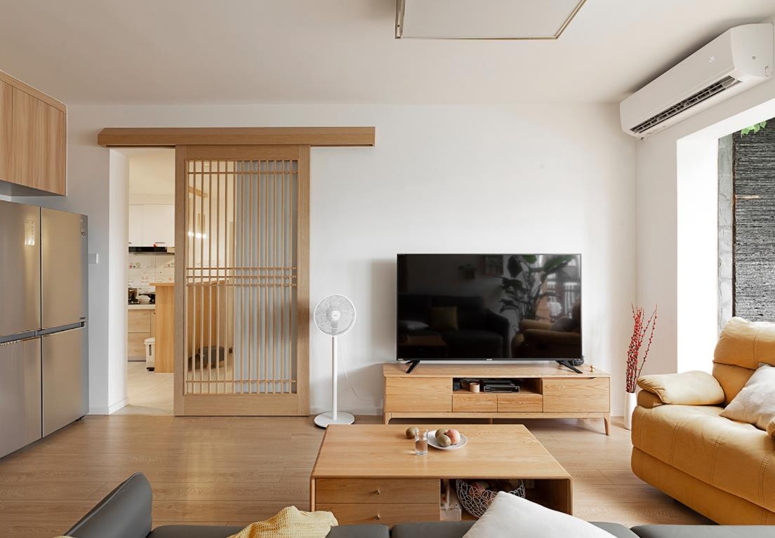 打开心灵的窗户,迎接一米阳光”,客厅电视墙的设计就更有意思了,设计师将厨房进客厅的门洞设计成一扇通透的推拉门,它不但是区分厨房与客厅的一扇门,更是一个衬托出日式风的造型背景,我们叫它“灵性”门。