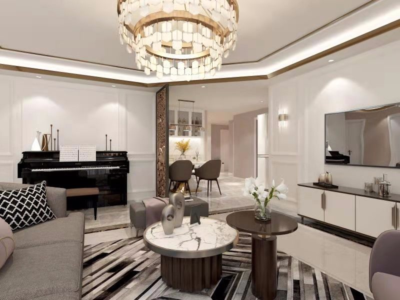 客厅护墙板,吊顶,灯具以及家具的选择都是多次协商,沟通后确定的米色系,白色系,金属色系为主要色系的现代轻奢风格