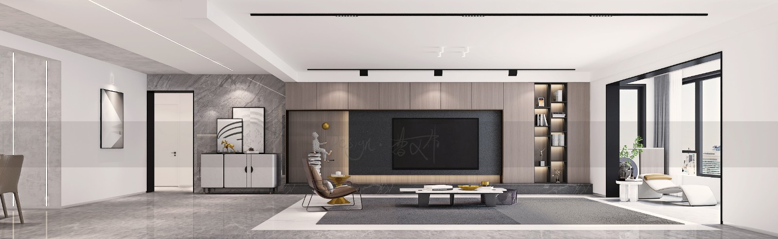 装修风格为现代简约风格,用明装磁吸轨道灯以及线性灯、明装筒灯作为光源,跟随时代潮流。