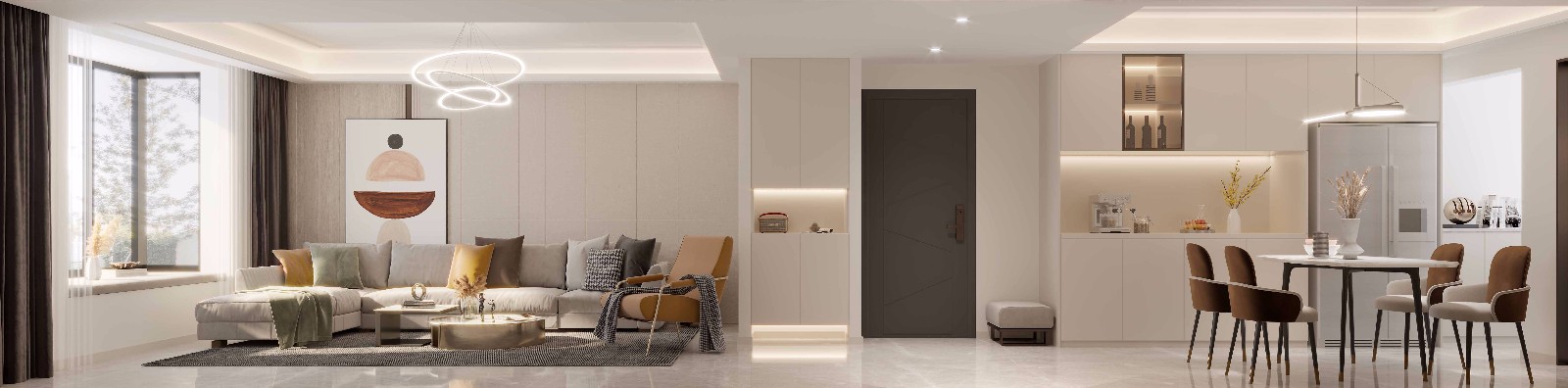 客餐厅效果井然有序,没有多余空间浪费,储物功能完备,动线流畅,观赏性高,室内通透,现代风格油然而生