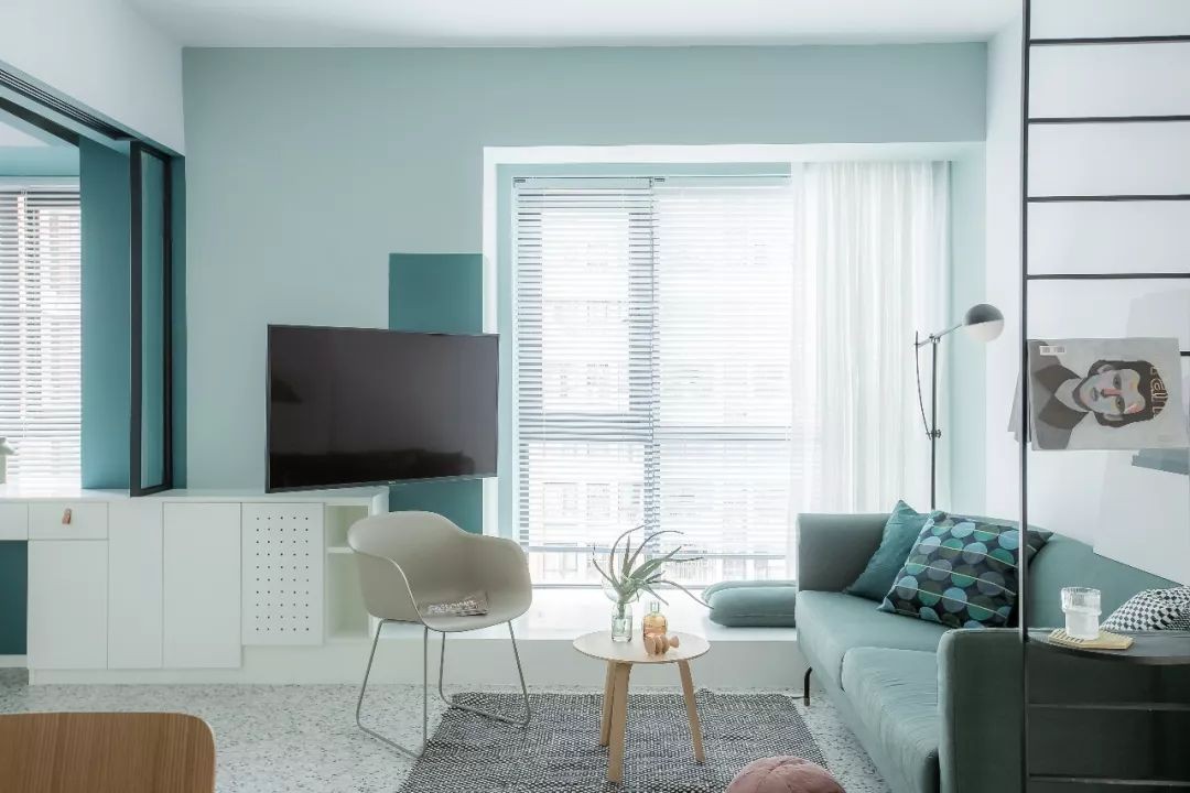 我们将客厅和紧邻的一间卧室的中间墙壁拆掉,改变开门位置,三居变两居,给客厅释放出更多空间。