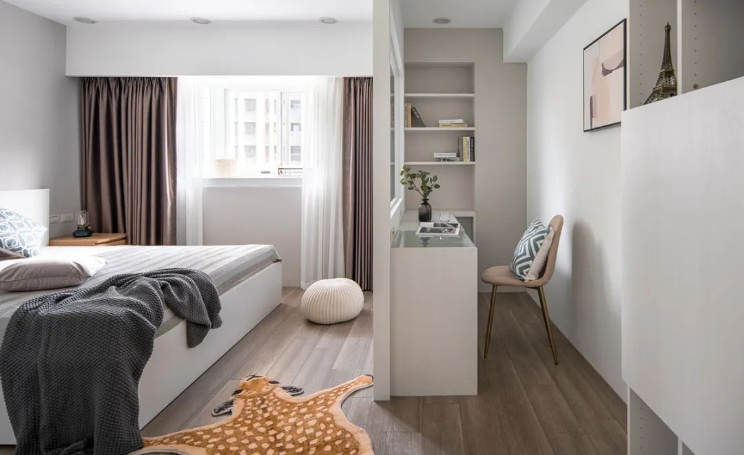 考虑到主卧的纵深偏长,特意隔出一个小书房。半墙+玻璃设计,即可采光也保证一定的私密性。