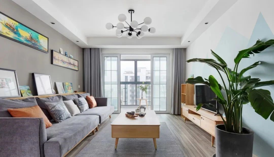 客厅以灰白色为主搭配简约的原木家具宽敞明亮的空间呈现温馨自然的舒适感。