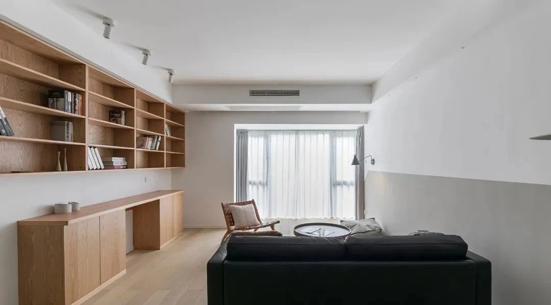 屋主夫妇很喜欢阅读,也希望言传身教将这种阅读兴趣传授给孩子,为满足屋主需求,在客厅墙面规划悬空书柜。