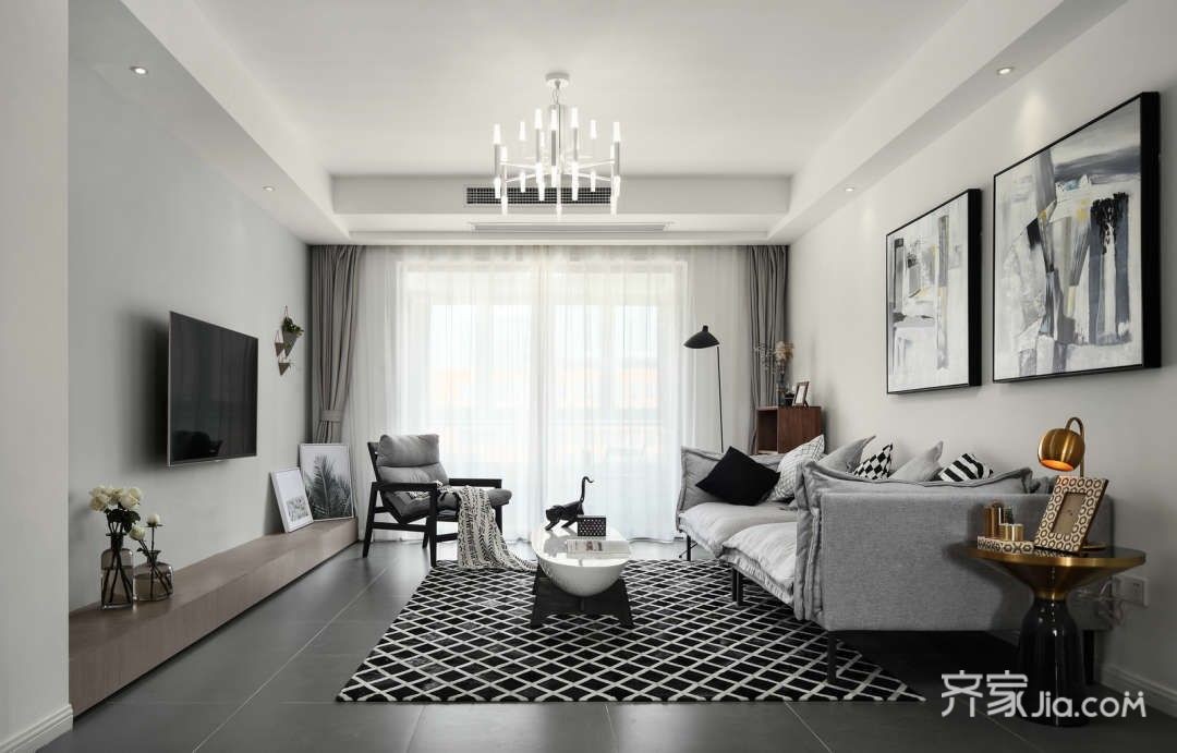 大理石桌面既美观大气又便于清洁,巨幅的装饰画让留白的墙面更丰富。灰白简约的硬装方案,让软装家具有了更多的可能性。