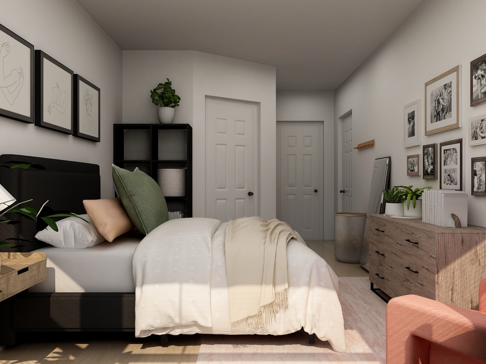 床的对面是五斗柜及照片墙。