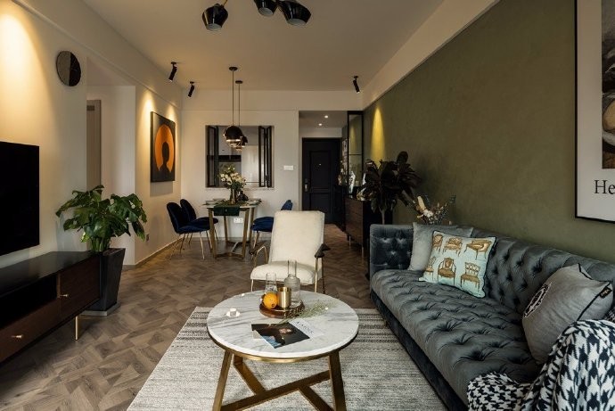 93㎡现代复古风,整体的色调是偏复古深沉的,尤其是在暖黄色灯光的搭配下,加上金属元素的点缀,显得更加时尚复古和精致。