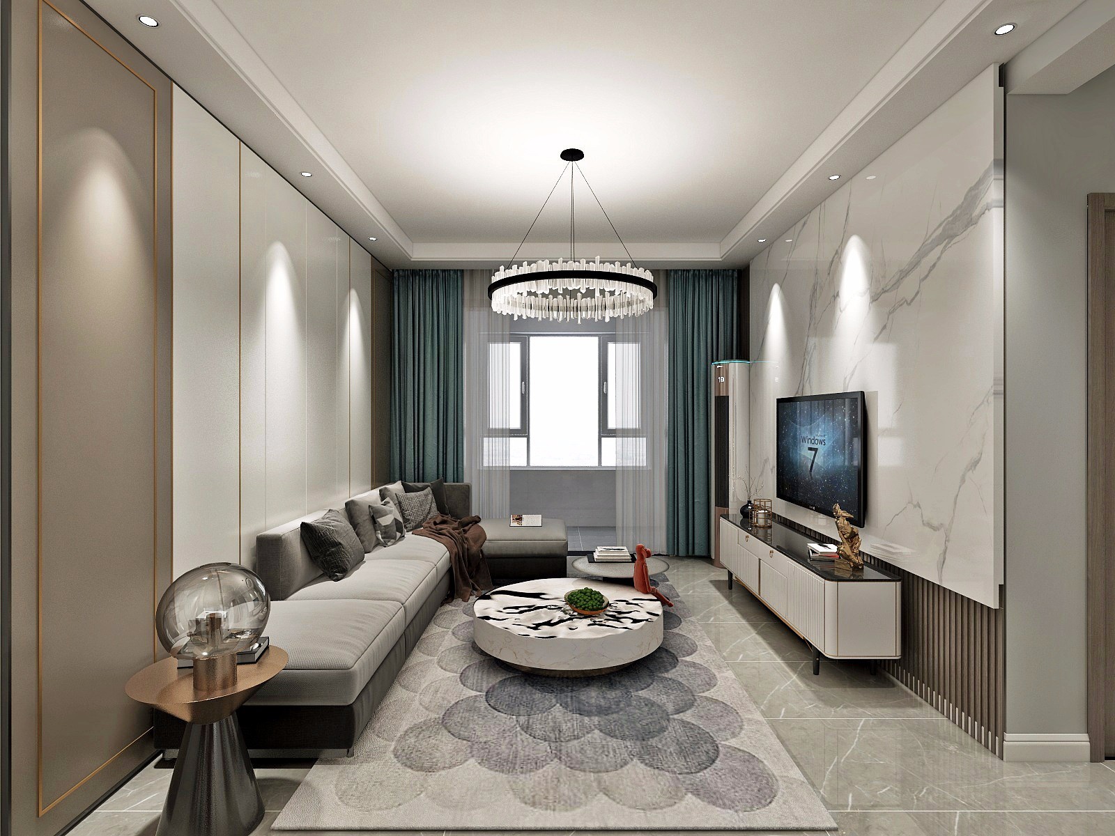 沙发背景墙和电视背景墙上都做了简单的造行,沙发背景墙上的金属条起到了很好地点缀作用,现代中带有轻奢的感觉。影视墙采用了大理石上墙的设计,整体搭配下来,既不过分张扬,又恰到好处的体现出家里的华贵之气。