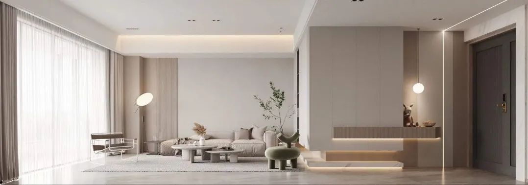 简约又有连接感的电视背景,搭配鞋柜书柜的转角衔接,让整个空间即简单又舒适。朴素的布艺沙发与地毯样式相辅相成、细腻温和。圆形茶几、透明单人椅、落地灯点缀其中,整体提升空间质感,让客厅现代简约风更加纯粹。