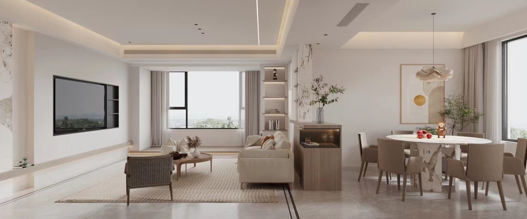 通透敞开的客厅,打掉原本的飘窗,增设木饰地台,让客厅空间不再单一。有趣的地台不仅可以品茶,还可作为瑜伽健身看书的慵懒休闲空间。地台更与电视背景墙白色与木色衔接,简洁又温暖,暗藏电视,搭配柔美的潘多拉岩板,使电视背景墙层次感分明,美观的同时让整体感更强。